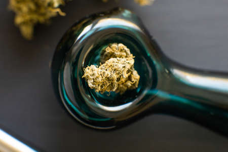 Bong and marijuana, cannabis thc flower Sativa and Indica Close up on a black background. lifestyle Concepts the legalization of marijuana in the world and the United States.