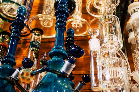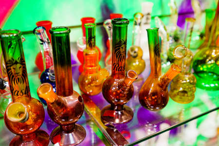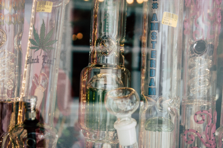 Amsterdam, Netherlands - November 16, 2021: Cannabis smoking equipment for sale in shop. Recreational use of cannabis is allowed in some countries but not others