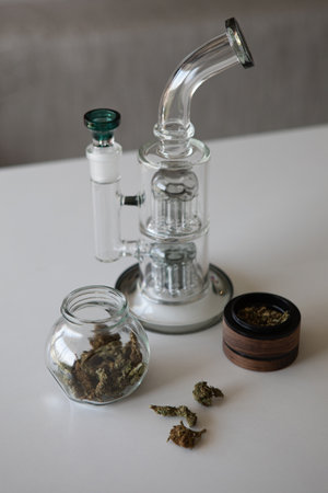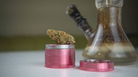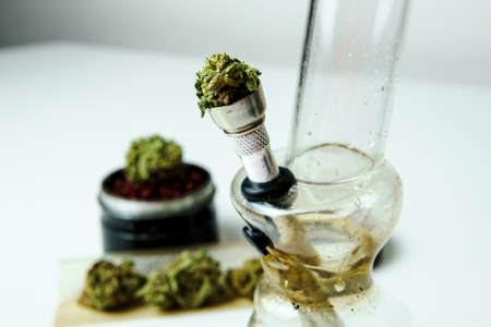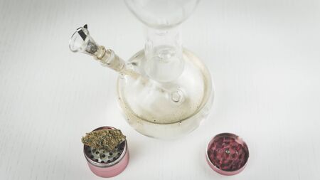 Close-up of dirty bong and grinder with medical marijuana buds on the white table. Smoking cannabis with water pipe. Hemp is a concept of herbal medicine.