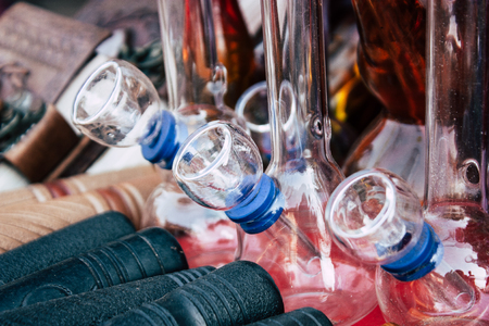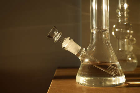 Closeup view of glass bongs on table, space for text. smoking device