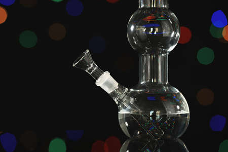 Closeup view of glass bong against blurred lights. smoking device