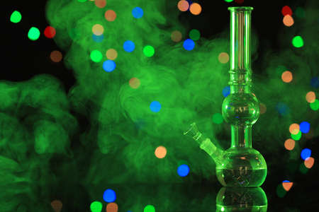 Glass bong with smoke against blurred lights, space for text. smoking device