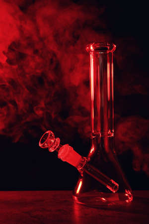 Glass bong and smoke on black background, toned in red. smoking device