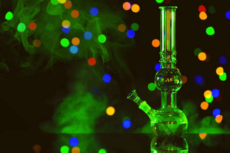 Glass bong with smoke against blurred lights, toned in green. smoking device