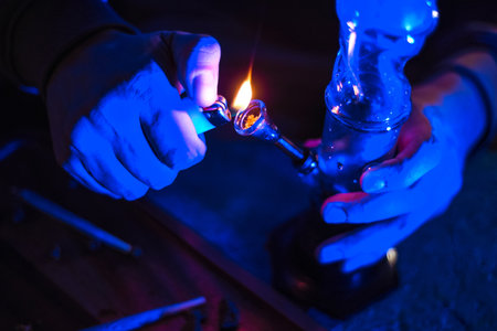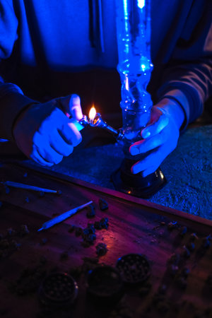 Male hands clog a bong with marijuana. A man smokes weed through a bong. Neon blue light. CBD treatment. medicine and drugs