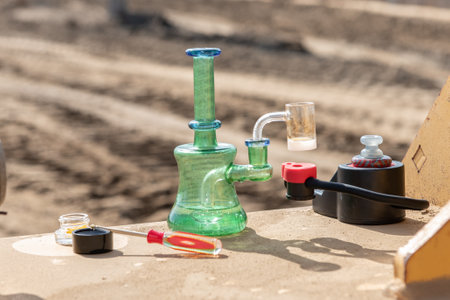 Flat lay of smoking weed accessories. THC use in healthcare.