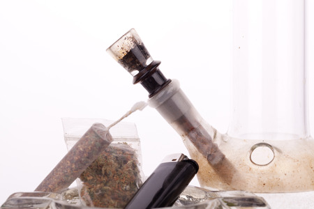 Clear glass bong packed with marijuana isolated on white