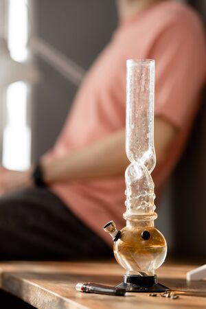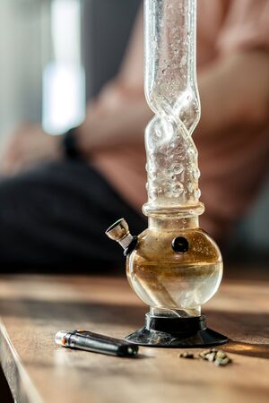 close-up photo of bong filled with hemp medicine, marijuana. drugs concept. relaxed man sit in the background