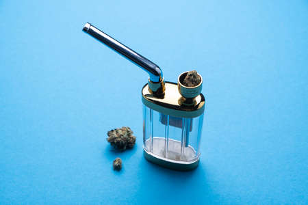 Hookah with marijuana on a blue background close-up.