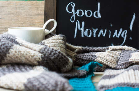 Winter time: cup of hot tea with lemon and scarf on rustic background