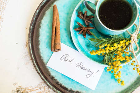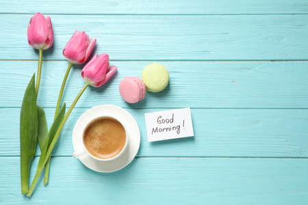Flat lay composition with message GOOD MORNING and coffee on light blue wooden table. Space for text
