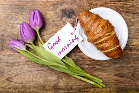 Cup of coffee, croissant and card with phrase GOOD MORNING on white tray, closeup