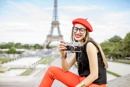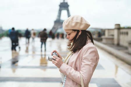 Portrait of a beautiful girl against the backdrop of the Eiffel Tower