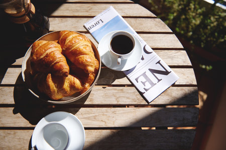 Sunlight-lit breakfast setting with flaky croissants, black coffee, and a newspaper on a wooden table, evoking relaxation and culinary delight in an outdoor space.