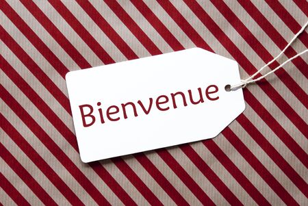 One Label On A Red And Brown Striped Wrapping Paper. Textured Background. Tag With Ribbon. French Text Bienvenue Means Welcome