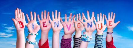 Children Hands Building Word Bienvenue Means Welcome, Blue Sky
