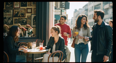A lively outdoor café scene with a group of friends enjoying drinks and conversation, bright sunlight, urban setting