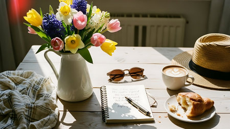 Coffee cup, notebook, hat, glasses and bouquet of spring flowers on wooden table