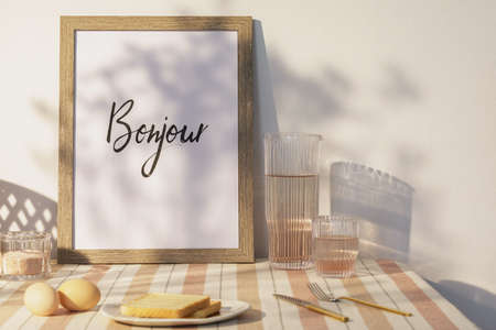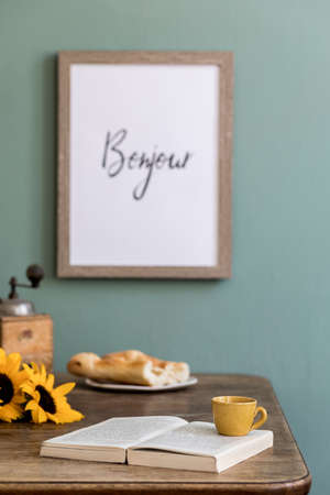Stylish and sunny interior of kitchen space with wooden table, brown mock up photo frame, breakfast meal and sunflowers. Scandinavian home decor with kitchen accessories. Template. Ready to use.