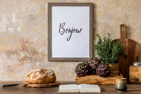Stylish interior of kitchen space with wooden table, brown mock up photo frame, herbs, vegetables, tea pot, cups and kitchen accessories in wabi sabi concept of home decor.