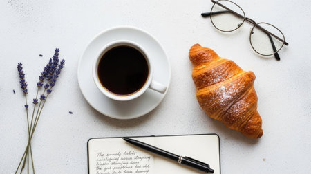 A top-down composition presents a morning breakfast scene, featuring a cup of coffee, a buttery croissant, lavender sprigs, and eyeglasses. The objects are arranged on a white surface, providing contrast. The image uses a natural daylight and soft shadows. Suitable for use in lifestyle or culinary-themed editorial content.
