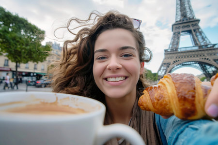 Young woman poses with pastry in hand, Eiffel Tower backdrop.