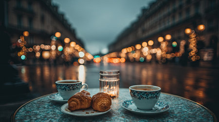 A table holds two cups of coffee and croissants, with a candle in a glass jar. The blurred cityscape in the background showcases illuminated buildings and streets. The composition features a shallow depth of field, creating a bokeh effect with warm and cool colors. This image can be suitable for commercial or editorial projects.