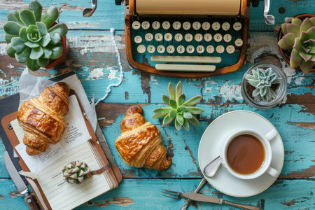 Chic flat lay vintage typewriter, coffee, succulents ideal workspace for writer or poet
