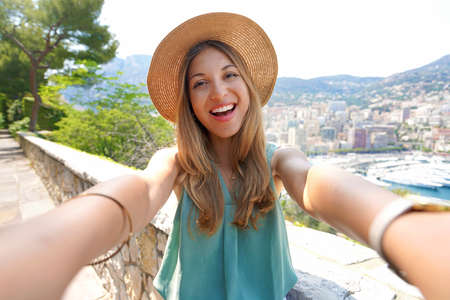Attractive tourist girl takes selfie picture with Monte-Carlo cityscape, Monaco