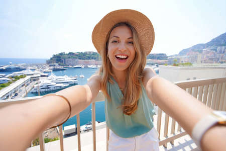 Beautiful tourist girl takes self portrait in Monte-Carlo, Monaco