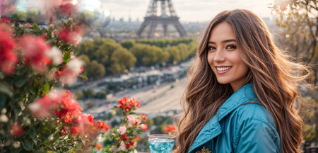 Young woman happily holds a coffee cup in front of the Paris Tower.