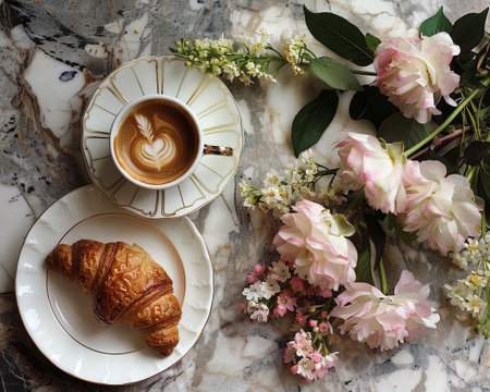 An elegant breakfast setting with a cup of espresso, a croissant, and fresh flowers on a table