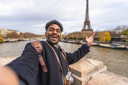Young male tourist smiling and gesturing with open hand, capturing a memorable selfie while enjoying a vacation on a bridge overlooking the seine river with the iconic eiffel tower