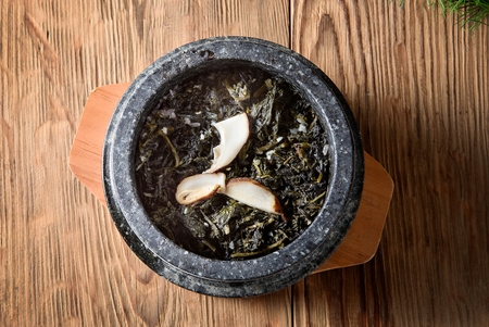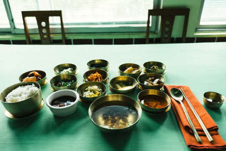 Abalone bibimbap with seaweed soup and side dishes. Korean local food.