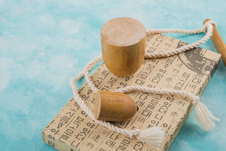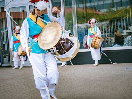 Moscow, Russia, July 12, 2018: Musician play on a Korean traditional percussion musical instrument Janggu double-headed drum with a narrow waist in the middle. Samul nori or Pungmul on the festival of Korean culture