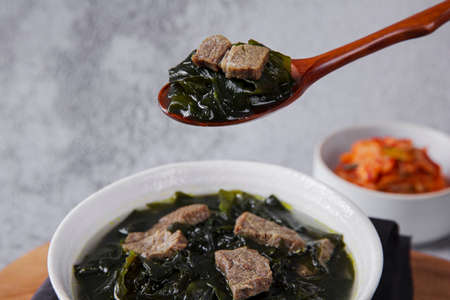 Homemade delicious dumpling Soup with seaweed egg drop soup in white bowl eat with kimbub. Asian food