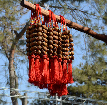 A close-up image of a brown wooden bead bracelet laid out on a plain light gray background. The bracelet consists of uniformly sized beads, creating a circular pattern. The beads are smooth and evenly spaced, showcasing the natural texture and color of the wood.