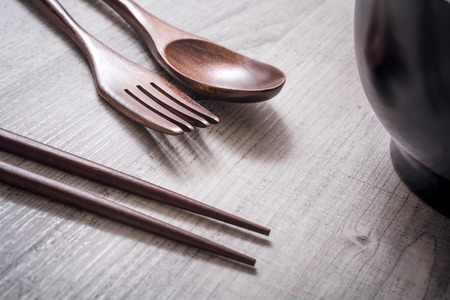 A Wooden Set Of Fork, Knife And Chopsticks Next To A Bowl On A Table - Eating Chinese Food Concept