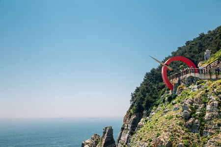 Busan city panorama beautiful skyline view from Hwangnyeongsan mountain observatory, Busan port, Gwangan bridge and harbor bay, South Korea, Yeongnam district, sunny day, travel to Republic of Korea