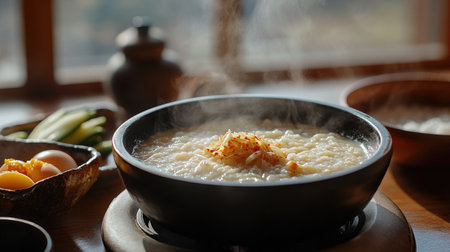 A steaming bowl of rice pudding presented in a rustic kitchen setting. This comforting dish evokes warmth and nostalgia, perfect for breakfast.