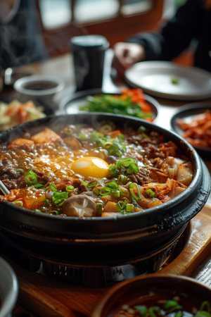 Spicy Soft Tofu Stew (Sundubu Jjigae) Simmering Hot in a Korean Earthenware Pot