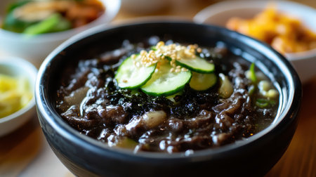 Jajangmyeon Bowl with Thick Noodles in Rich Black Bean Sauce, Topped with Beef and Vegetables