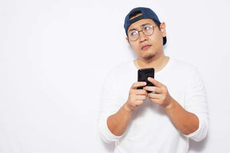 Young Asian man smiling, thinking and looking up while chat messaging on his smart phone, half body portrait over white background