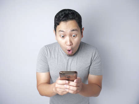 Portrait of happy funny Asian man shocked or surprised with mouth open, good news on smart phone concept, amazed winning gesture