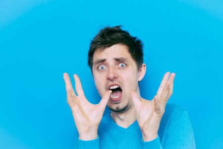Frightened man. Emotion of fear. Scared screaming male, threaten concept