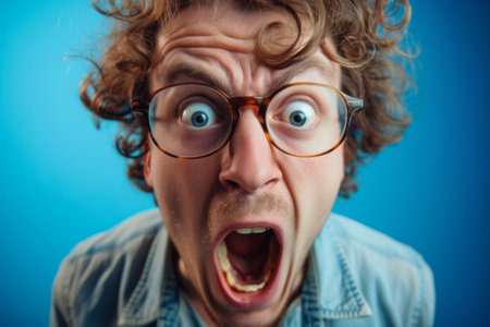 Closeup portrait of a young man with glasses and surprised facial expression