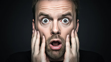 A close-up portrait of a surprised person with wide eyes and an open mouth, capturing genuine astonishment and emotion. The intense expression evokes curiosity and engagement.