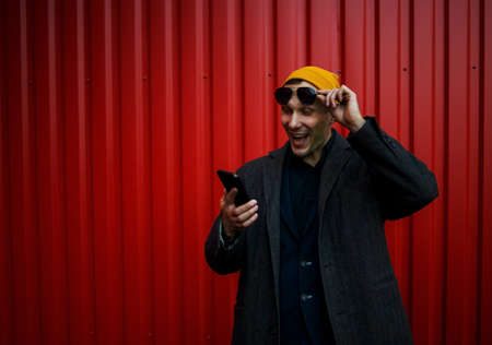 Happy young man using smartphone app outdoor with red background - Fashion guy having fun with new app trend technology