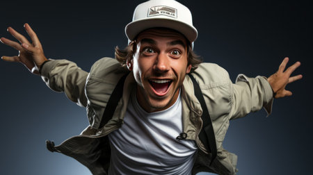 Portrait of a shocked Caucasian man in a cap and t-shirt, with an open mouth in surprise and big eyes.
