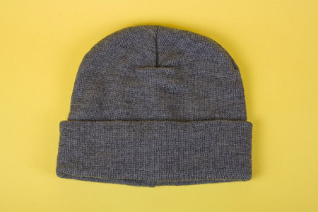 gray knitted hat on a yellow background. top view, flat lay